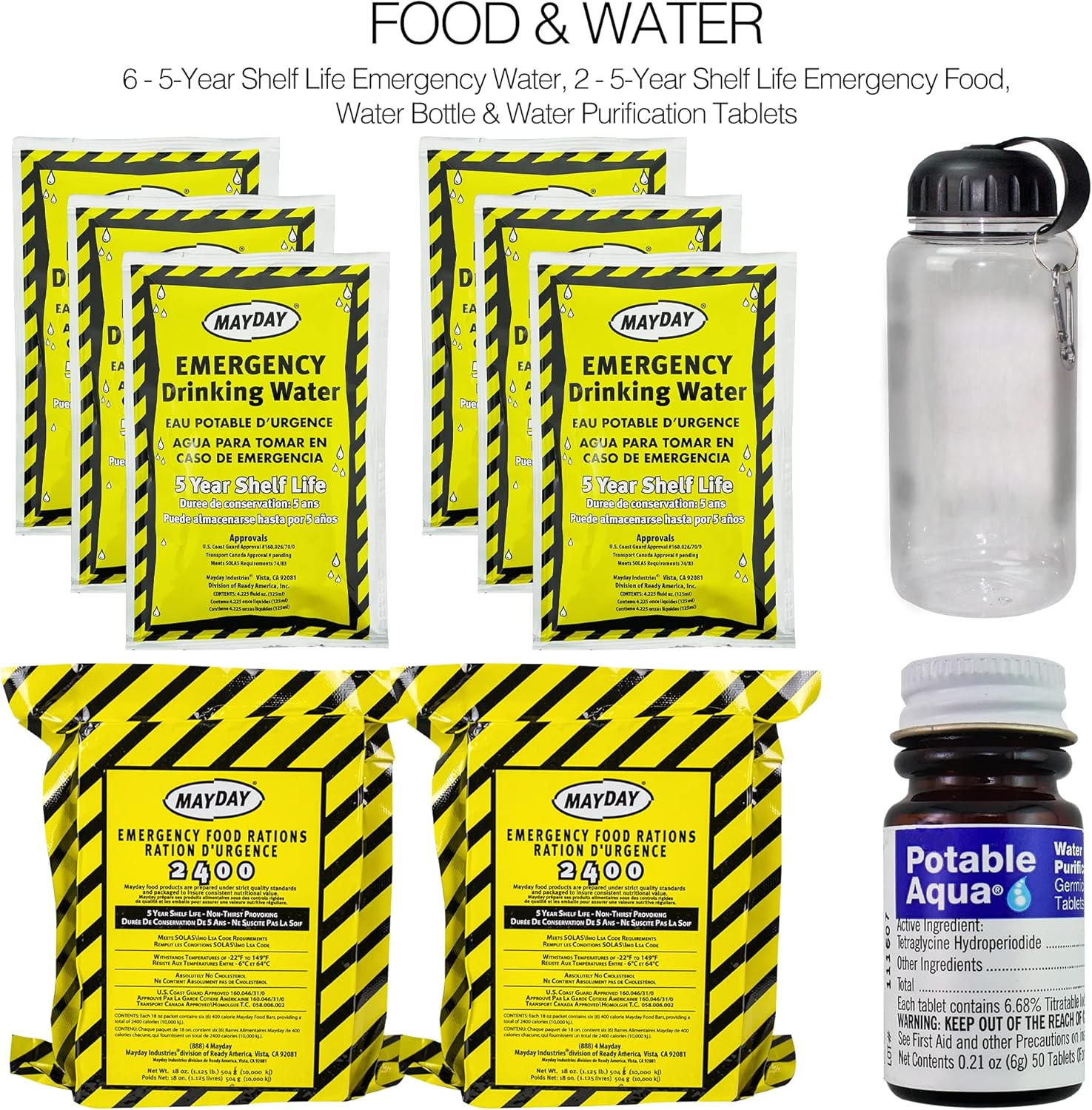 This kit comes with 2 U.S. Coast Guard-approved survival food bars, each providing 2,400 calories. In addition, it includes 6 water pouches (4.225 oz each), a BPA-free water bottle, and water purification tablets. Both food and water have a 5-year shelf life, so you can store them safely for the long term. Consequently, you stay hydrated and energized while waiting for help or during extended emergencies.