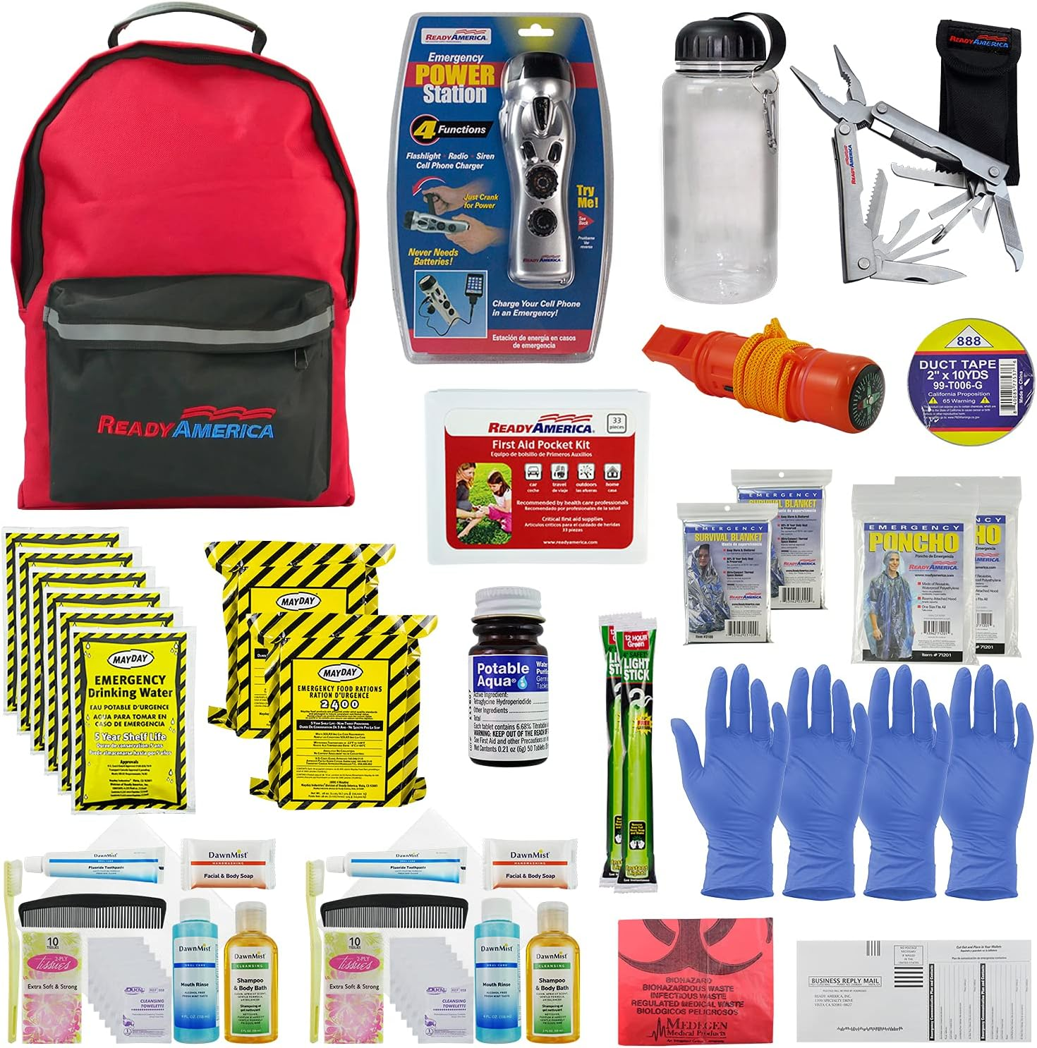 The 72-Hour Deluxe Emergency Kit includes versatile tools for many situations. A stainless steel pocket tool with screwdriver, pliers, and knife functions helps you perform small repairs, prepare food, or build a shelter. Moreover, the hand-crank power station provides a flashlight, radio, USB charger, and siren, giving you light, communication, and signaling options. In addition, the kit contains survival blankets, ponchos, and dust masks to protect you from cold, rain, or smoke. Therefore, you are ready for almost any emergency scenario.
