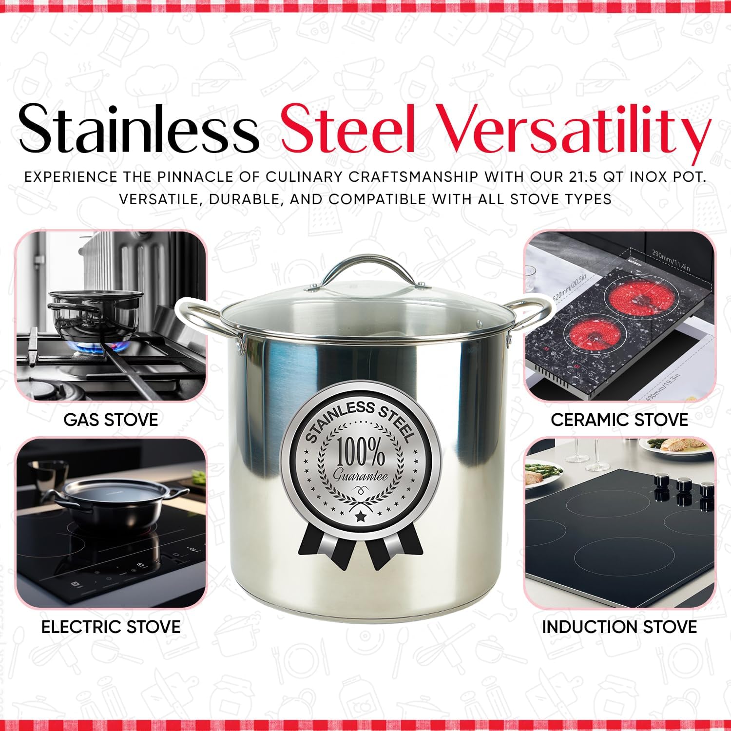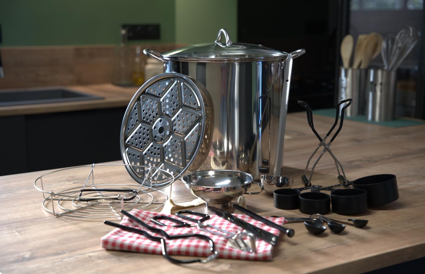 - THE PERFECT CANNING KIT: Discover this PREMIUM quality canning kit. THE ONLY KIT equipped with a high-end 21.5 Qt pot in food-grade stainless steel 304 with a shiny finish, compatible with all stovetops, including induction, ceramic, gas, and electric.
