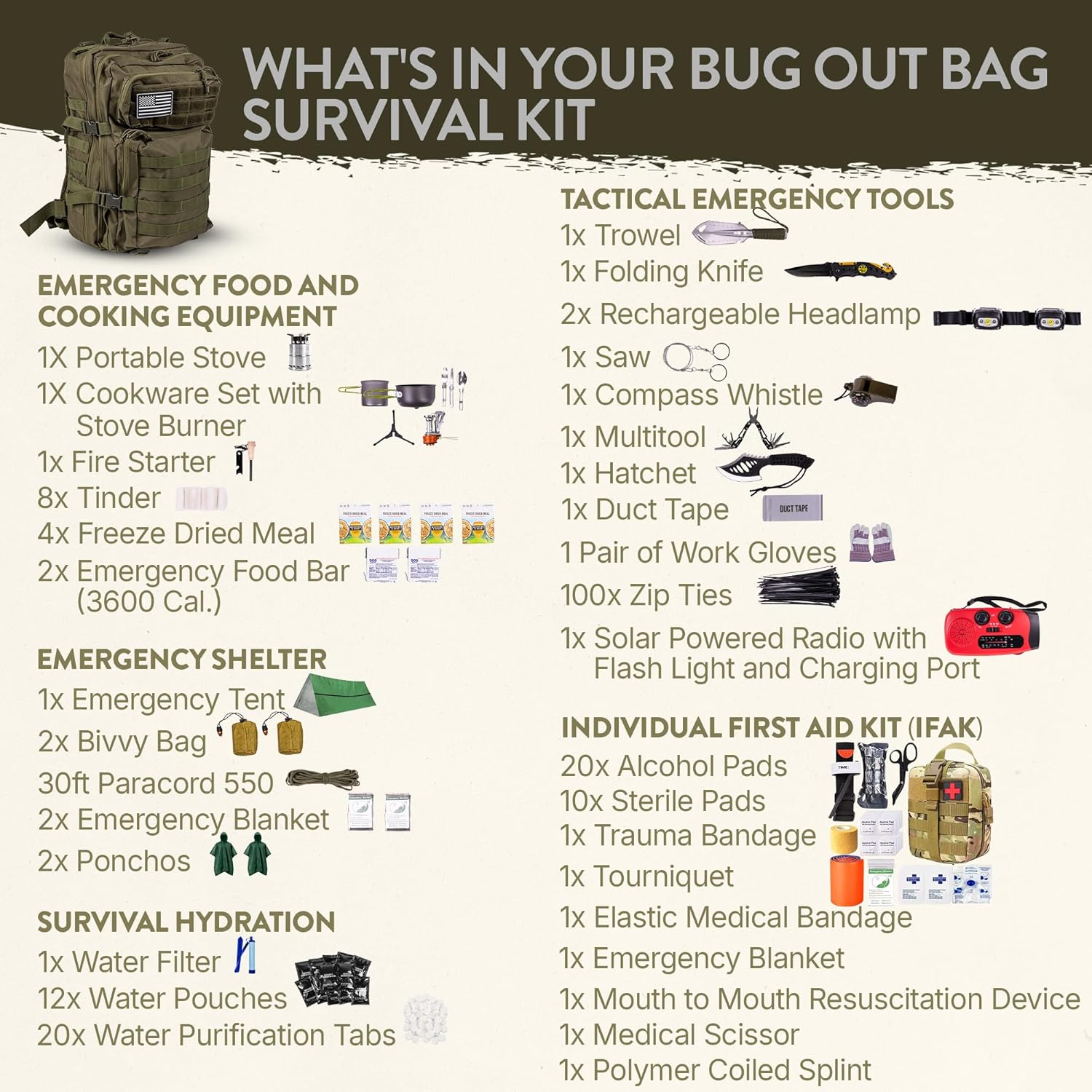 Stay prepared with the Emergency Bug Out Bag -72 Hour Survival Kit. It gives you food, water, first aid, and tools to stay safe for up to three days.