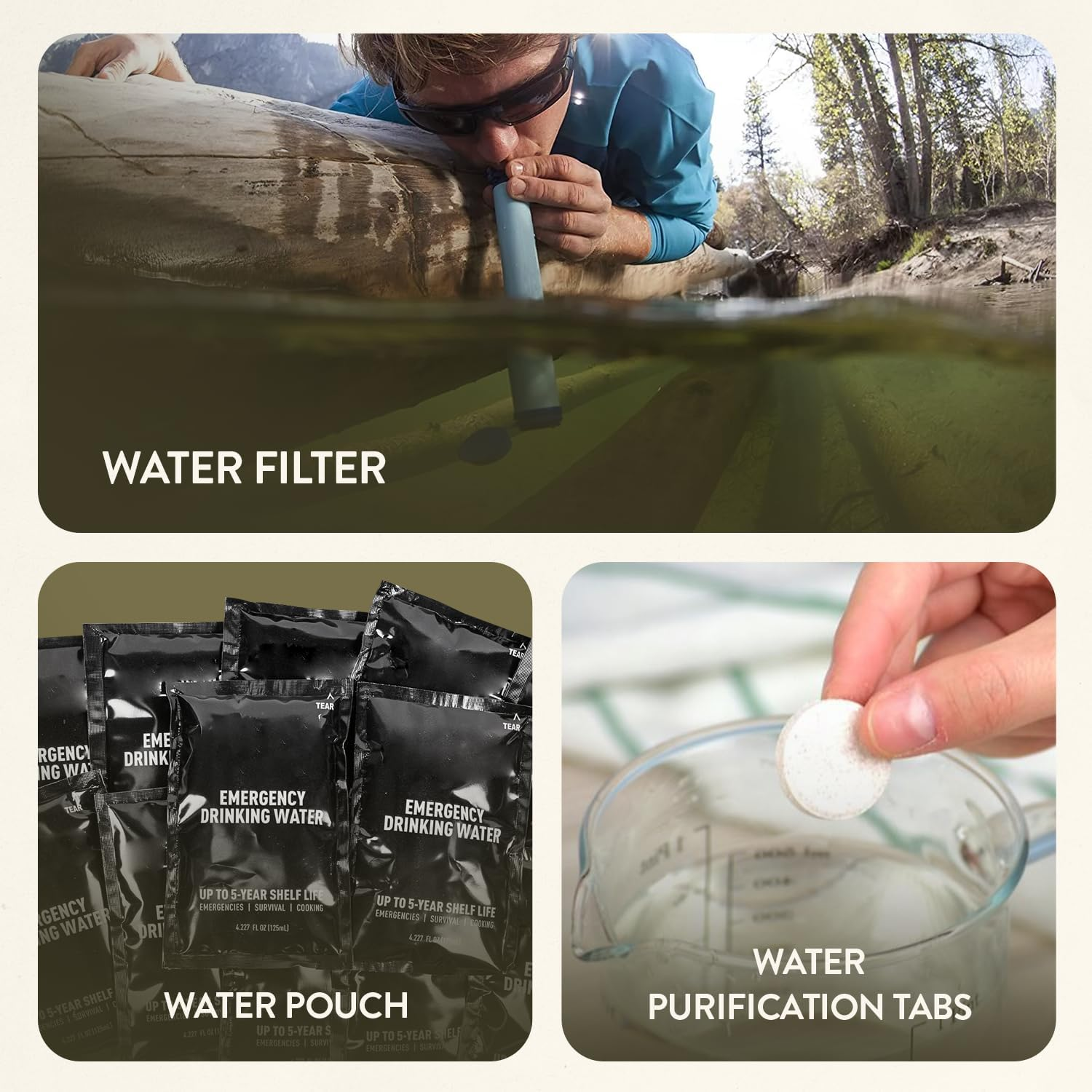 The kit includes a water filter, 12 water pouches, and 20 purification tablets. You can safely drink water anywhere. Moreover, you don’t need to rely on outside sources, which gives you more control in emergencies.