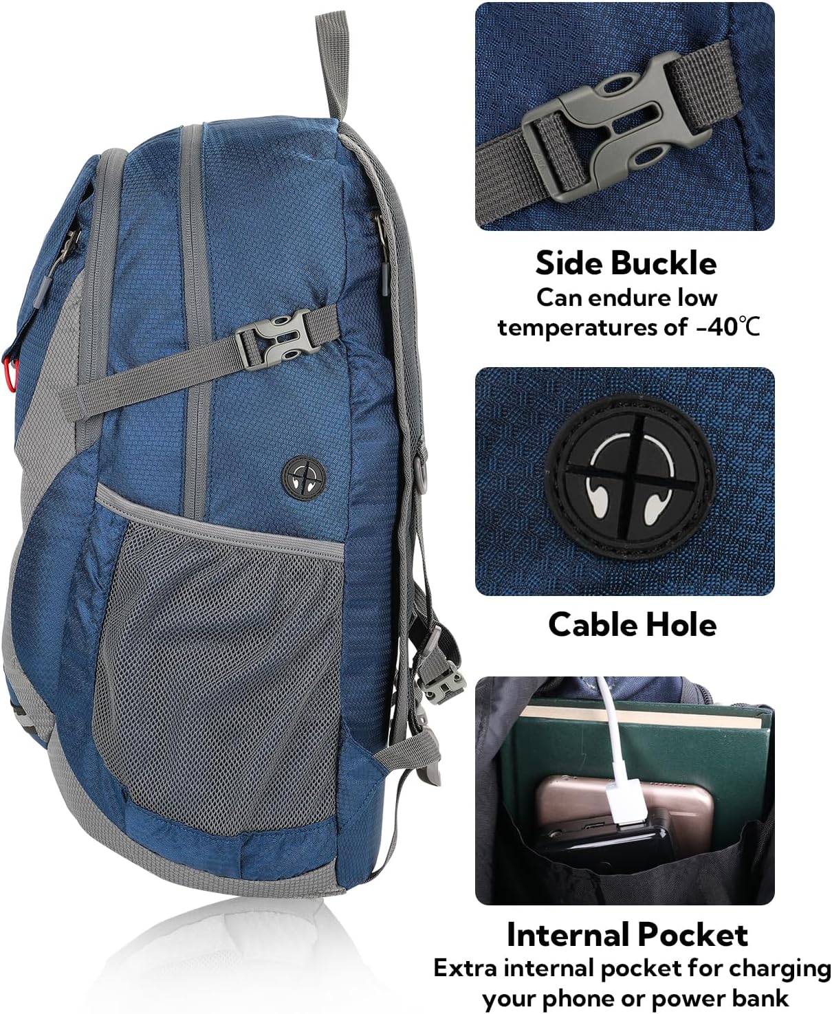 This backpack includes a cable hole and internal pocket. You can charge a power bank while on the move. Moreover, the side buckle withstands temperatures as low as -40℃. Therefore, it works in harsh weather.