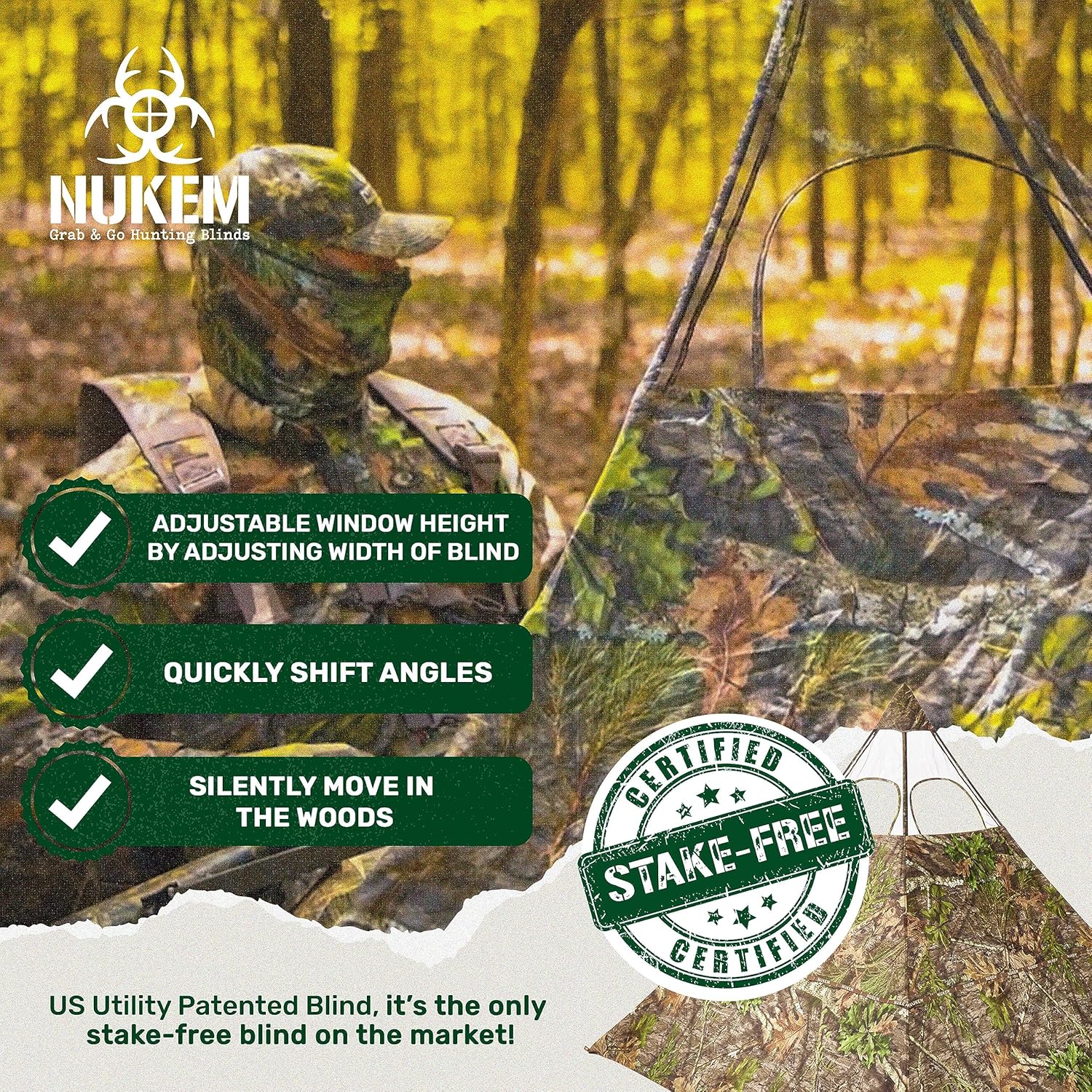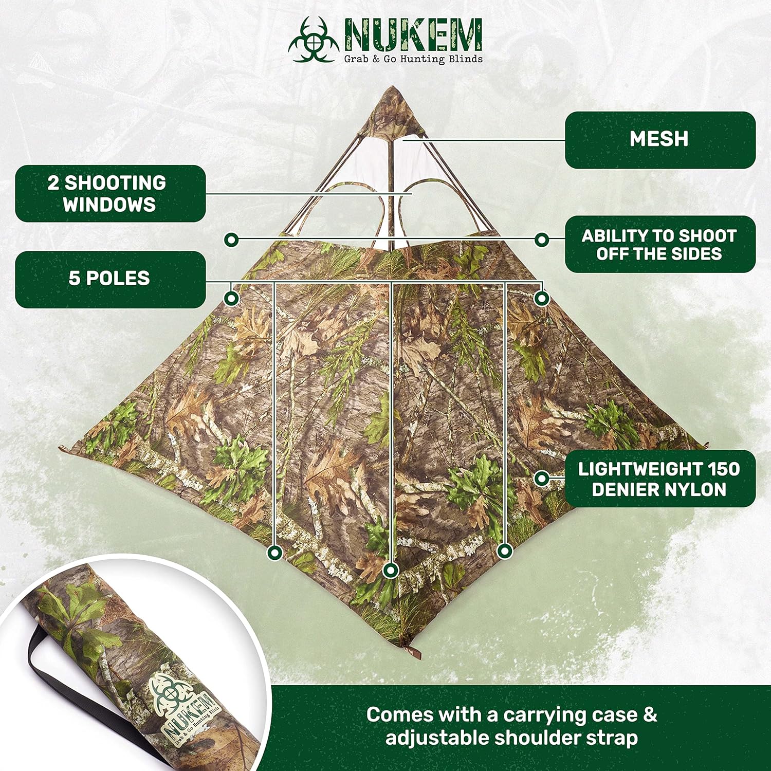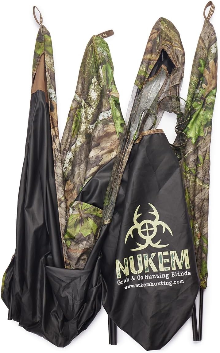 • UNMATCHED DESIGN FOR MOBILITY: Made with lightweight 150 Denier Nylon and super lightweight at just 3 lbs & 32 inches long when folded. The Nukem ground hunting blind fits in your pack & is the most compact pop-up blind on the market. Our mobile hunting blinds are a great match for your turkey & duck hunting accessories and deer blind accessories. The ideal pop-up lightweight mobile hunting blinds.